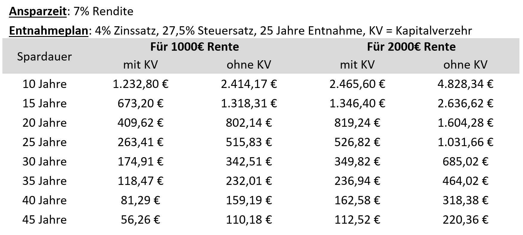 Je nachdem wie lange man noch Zeit hat bis zu seiner Pension oder bis zum gewünschten Beginn seines Entnahmeplans sind die folgenden monatlichen Beträge notwendig: