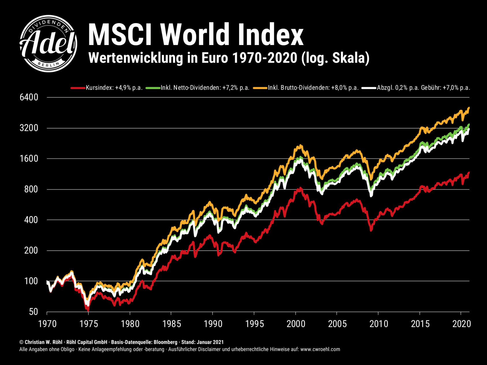 Der MSCI World, ein globaler Aktienindex, der die Kursentwicklung von 1.600 Unternehmen aus 23 Ländern abbildet, wäre ein Beispiel für eine simple Methode um den Vermögensaufbau für einen Auszahlungsplan zu betreiben. Dieser Index hat über die letzten 50 Jahre ca. 7 % pro Jahr an Rendite erwirtschaftet. Die grüne Linie zeigt die Netto Rendite inkl. Dividenden seit 1970.
